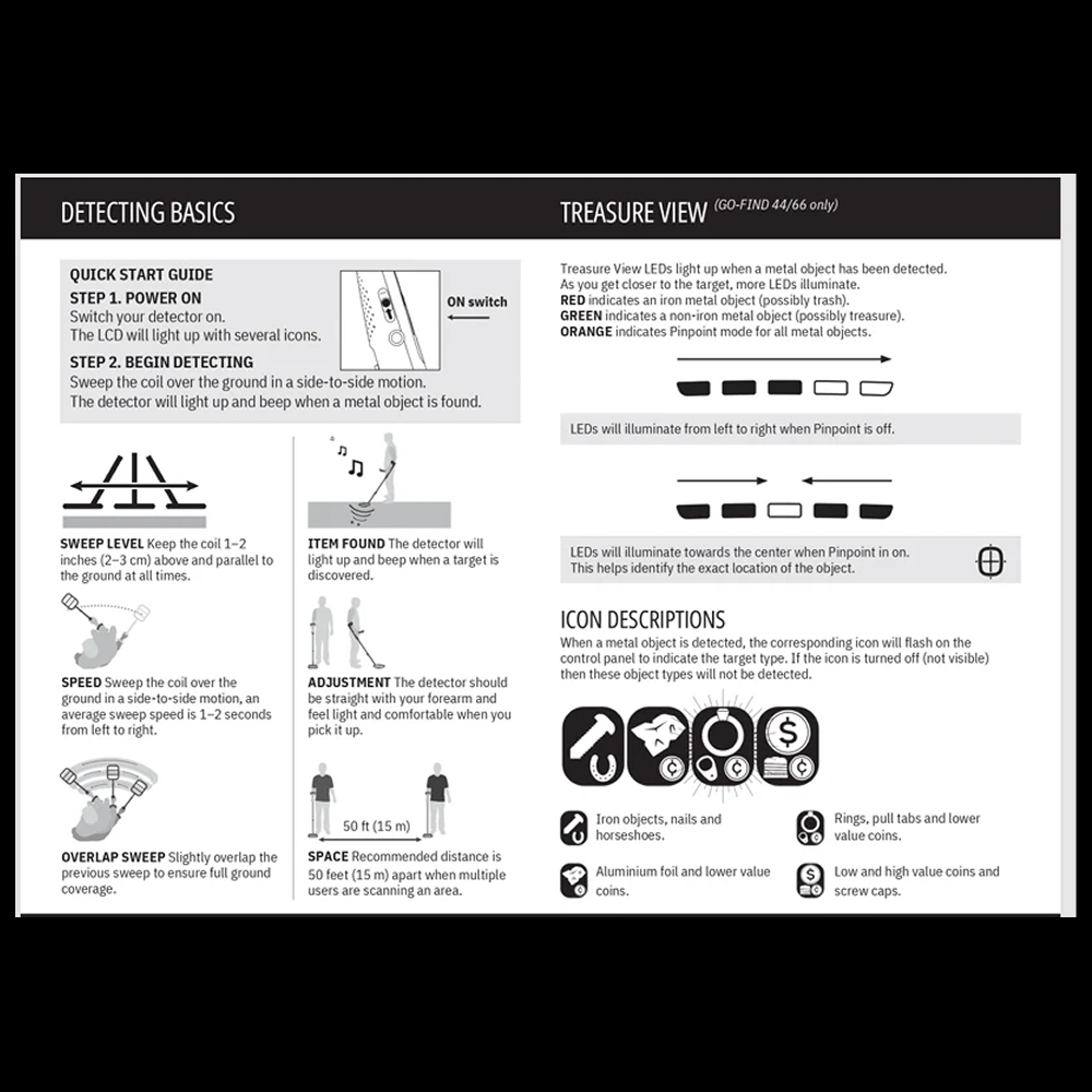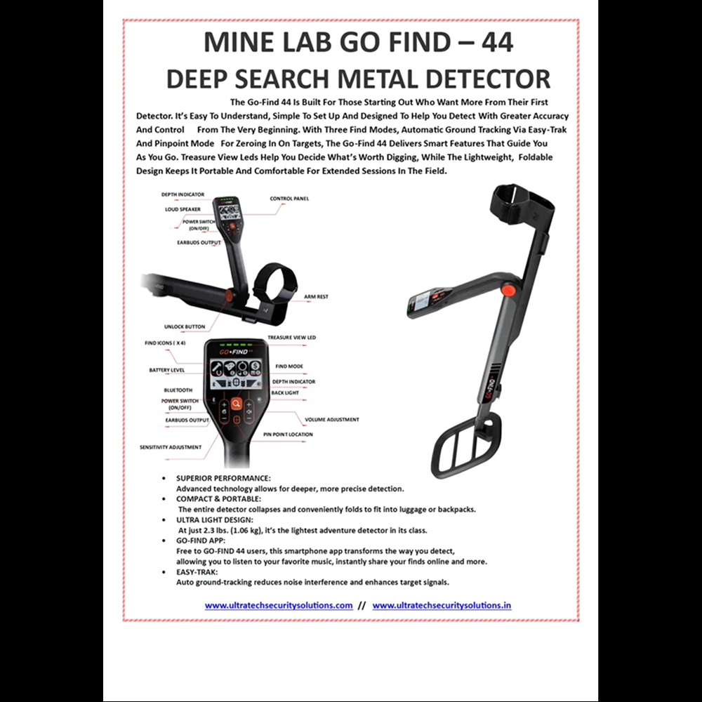 The GO-FIND 44 is an entry-level metal detector packed with advanced features for superior performance. It is compact, lightweight, and requires no assembly, making it ideal for beginners and hobby users.