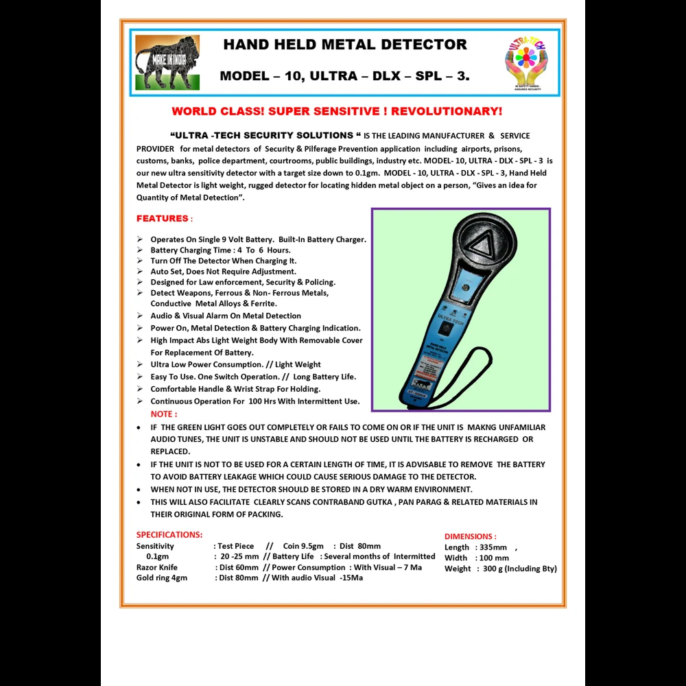 Model 10 Ultra DLX SPL-3 is a high-sensitivity hand-held metal detector capable of detecting small metal objects up to 0.1 gm. It is lightweight, rugged, and designed for accurate detection and quantity indication.