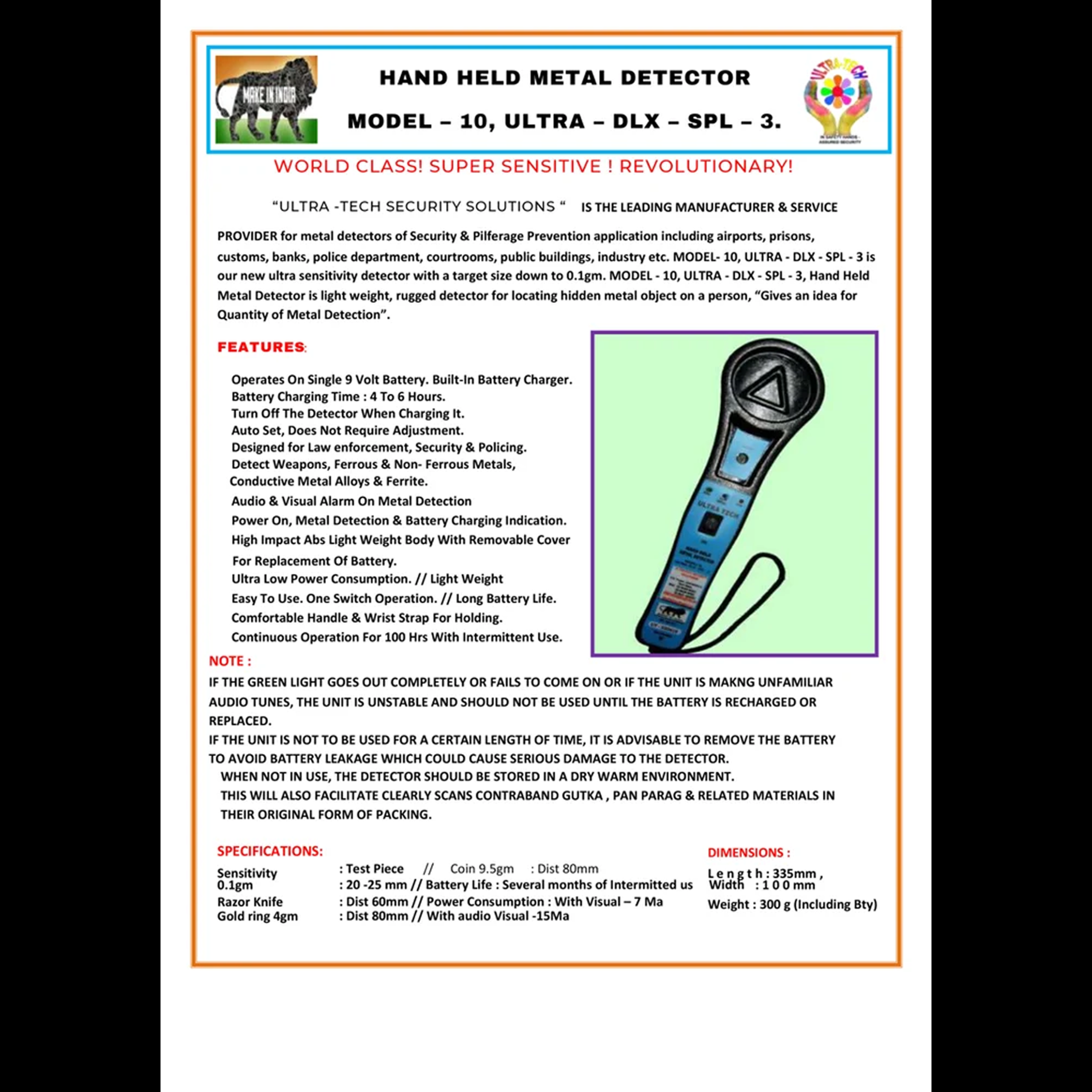 - Model Name/Number: GARMENTS METAL DETECTOR – ULTRA AH 01