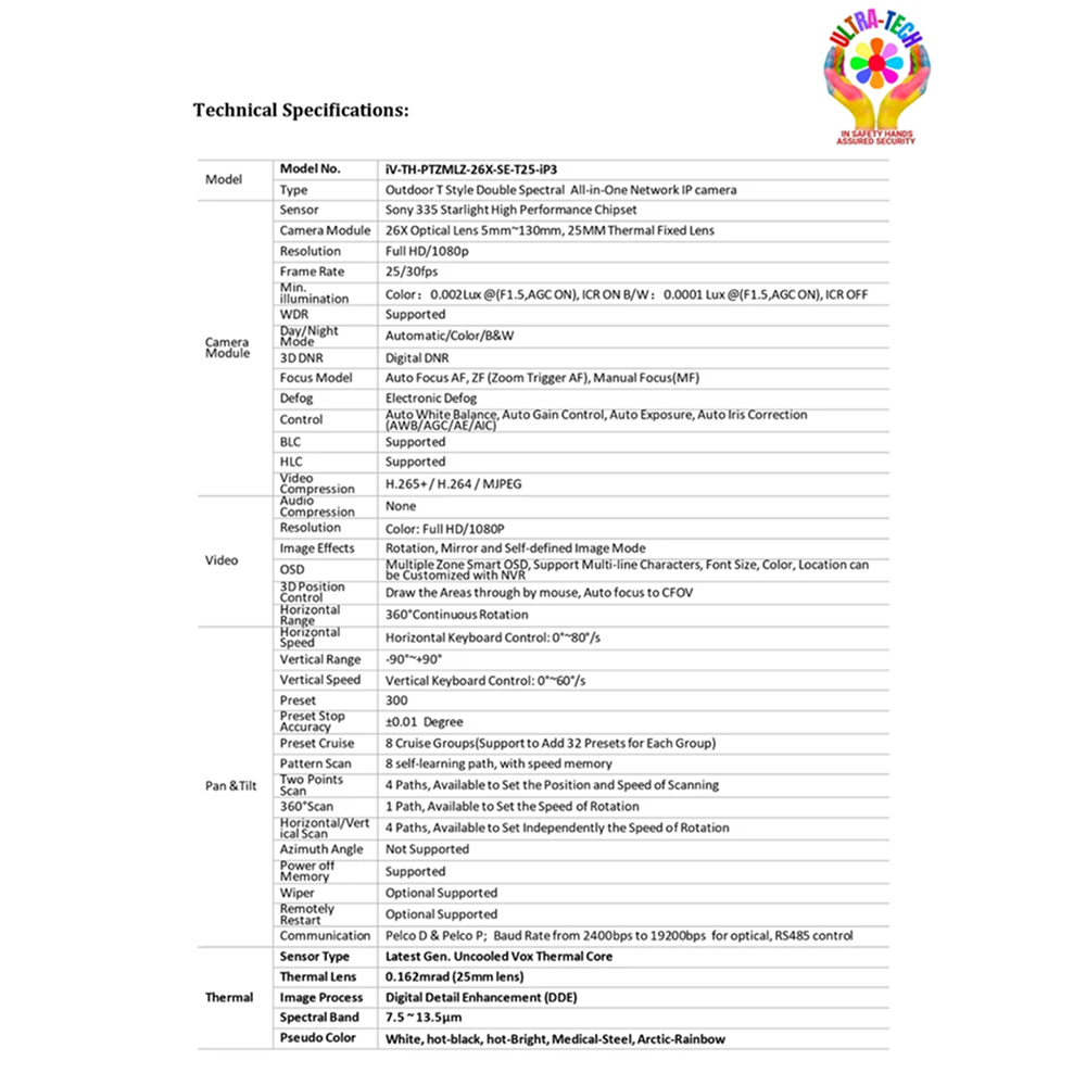 iV-Pro Model iV-TH-PTZMLZ-26X-SE-T25-iP3 is a compact outdoor dual-spectrum thermal PTZ camera designed for mid-range surveillance. It combines a 2 Megapixel HD optical system with thermal imaging powered by the Sony 323 Starlight processor, delivering clear visuals with efficient bandwidth usage.