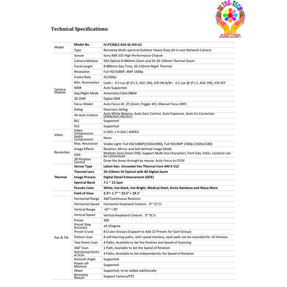iV-Pro Model iV-TH-PTZMLZ-92X-XT-iP4-V2 is a high-performance outdoor dual-spectrum thermal PTZ camera designed for ultra long-range surveillance. It combines a 4 Megapixel HD optical system with a powerful thermal imaging module powered by the Sony 335 Starlight image processor, delivering exceptional clarity with optimized bandwidth efficiency.