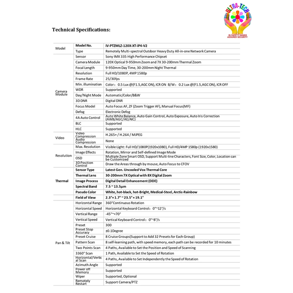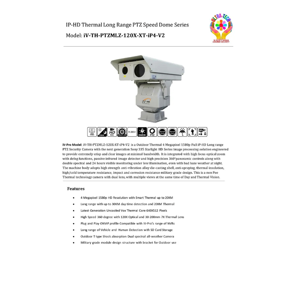 iV-Pro Model iV-TH-PTZMLZ-120X-XT-iP4-V2 is a high-end outdoor dual-spectrum thermal PTZ camera designed for ultra long-range surveillance. It combines a 4 Megapixel HD optical system with a powerful thermal imaging module powered by the Sony 335 Starlight image processing engine, delivering exceptional clarity with optimized bandwidth efficiency.
