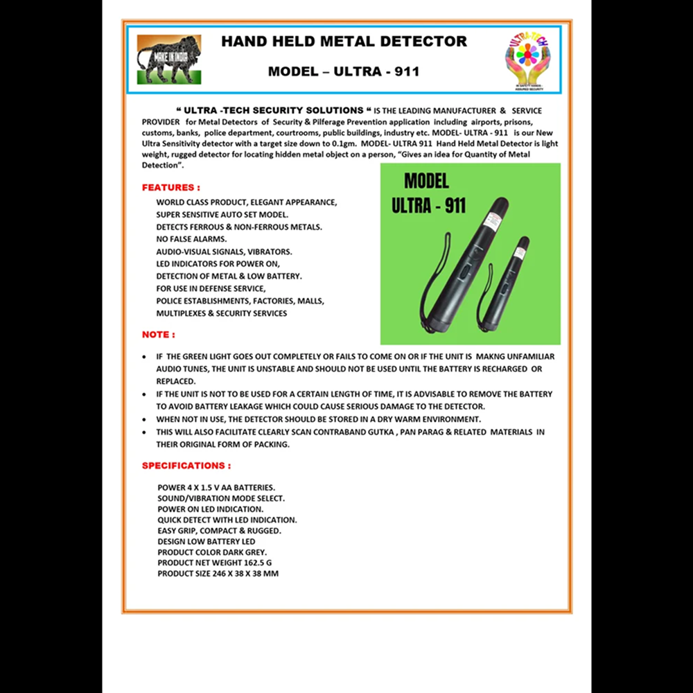 ULTRA-911 Hand Held Metal Detector is a high-performance device designed for reliable metal detection across security and industrial environments. It combines sensitivity, durability, and ease of use in a compact design.
