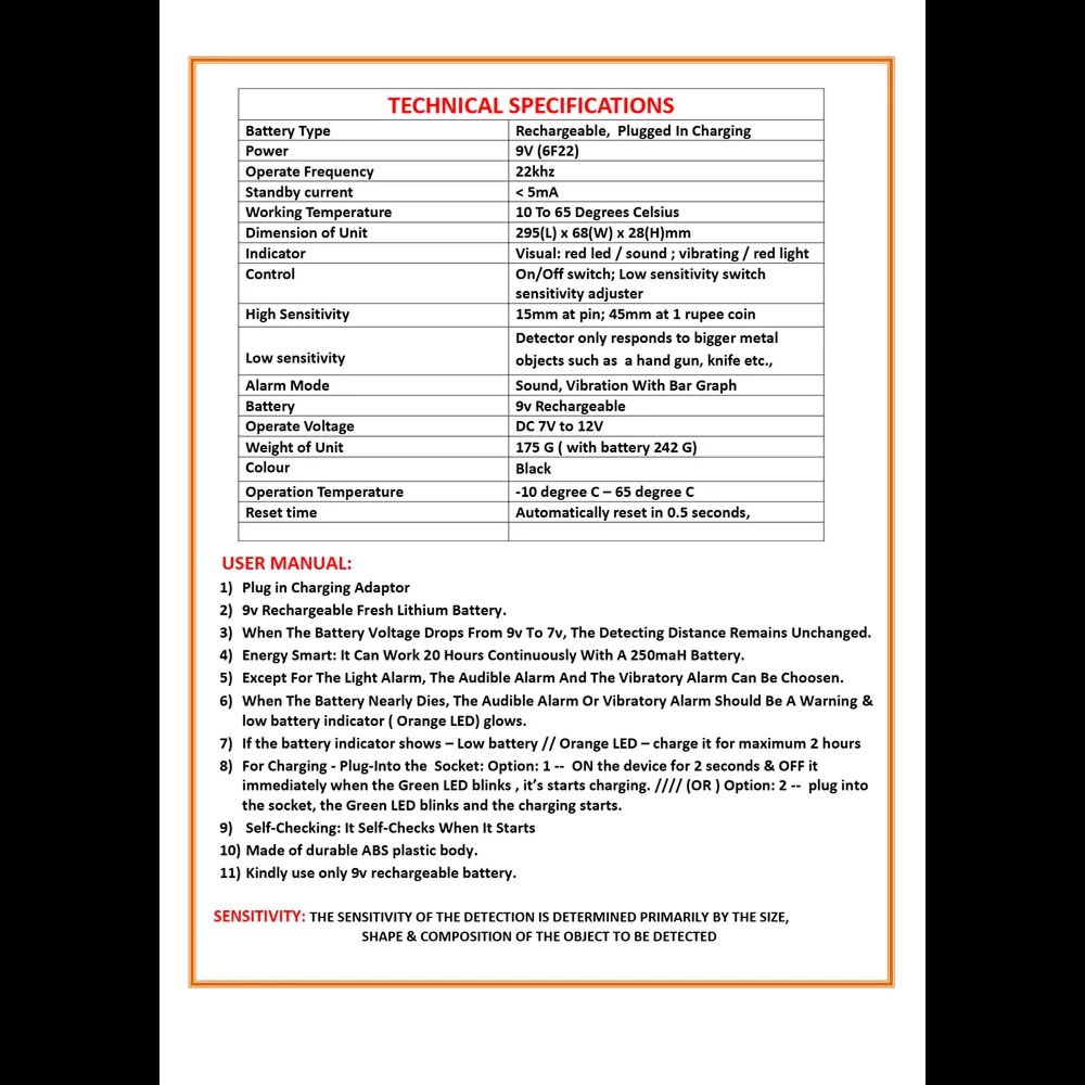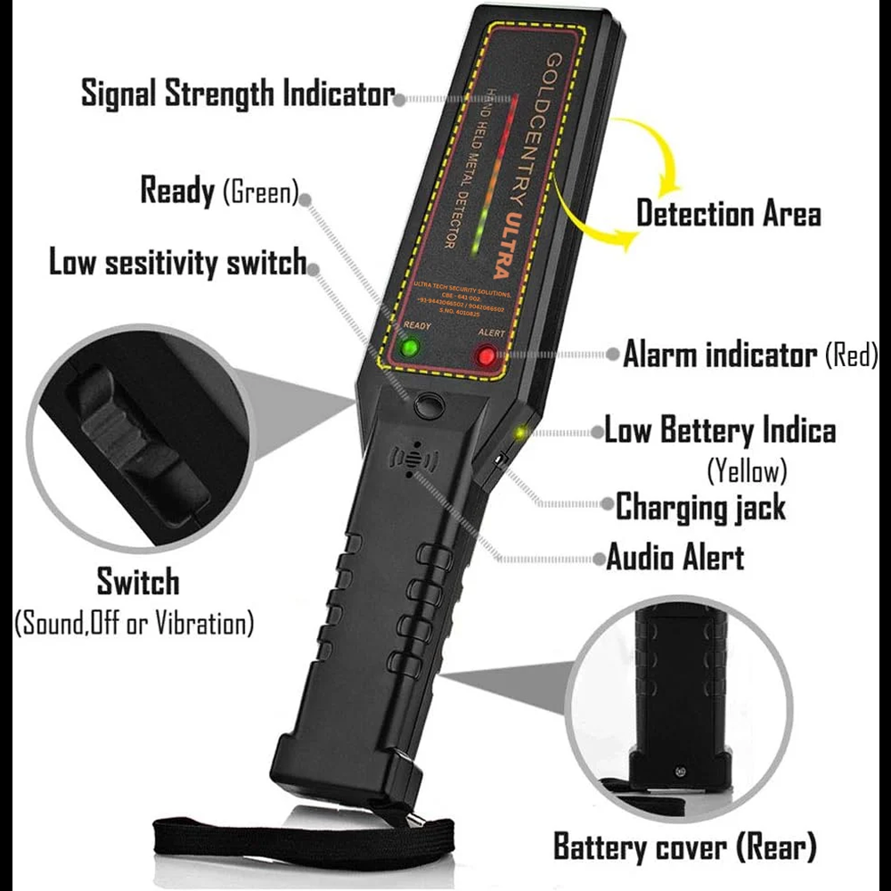 The MODEL – ULTRA GOLD CENTRY is a new ultra-sensitivity detector with a bar graph display. This hand-held metal detector is lightweight, sleek, stylish, and rugged, designed to detect hidden metal objects on a person. It also provides an indication of the quantity of metal detected.